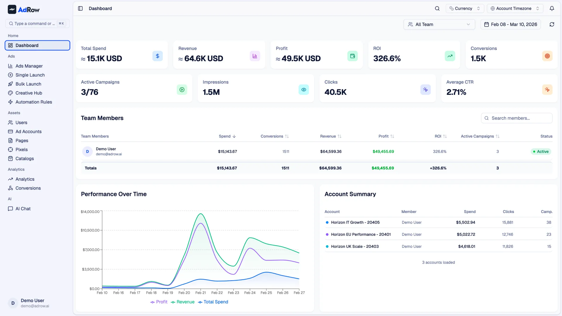 AdRow connects your entire Meta Ads ecosystem in one workspace. Launch campaigns in bulk across every account. Track ROAS across every account. Automate rules with Telegram alerts. From €79/mo.
